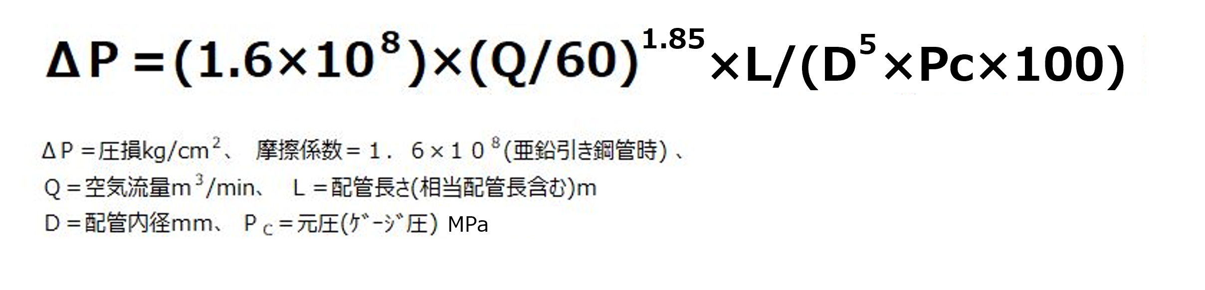 許容圧力損失をΔP(MPa)としたときの配管長さ(曲がり等がある時は、直管に換算)は次式で求めることができます。配管長さを求めるときの参考にご使用ください